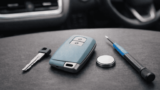 - カバーの分離: スマートキーの下部、または側面にあるスリット(溝)に、布を巻いたマイナスドライバー(またはコイン)を差し込みます。テコの原理で軽く捻るようにして、カバーをパカッと二分割します。無理な力を入れるとプラスチックのツメが折れるので、ゆっくり開いてください。